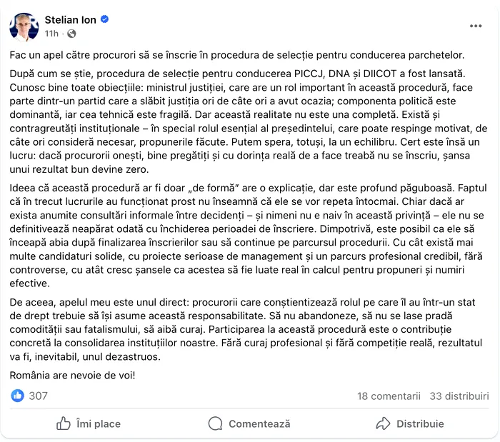 Liderul USR, Stelian Ion, a postat aseară târziu un mesaj pe pagina sa de socializare în care face apel la procurori să intre în procedura de selecție pentru șefiile marilor parchete. Deși zona politică n-ar trebui să interfereze în selecțiile și procedurile interne ale Justiției, fostul ministru USR al Justiției, nu numai că lansează un mesaj politic la adresa procurorilor – atacându-l partinic pe actualul ministru al Justiției din Guvernul din care și USR face parte, dar vorbește și despre “consultări informale între decidenți” în timpul derulării procedurilor, lăsând impresia unui troc politic pe numirea procurorilor.