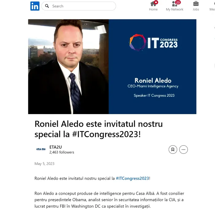 În mai 2023, Ron Aledo era invitat la conferința „IT Congress 2023”. El era prezentat ca fost consilier al președintelui Barak Obama. Organizatorii conferinței spuneau că Aledo a lucrat la FBI și CIA.