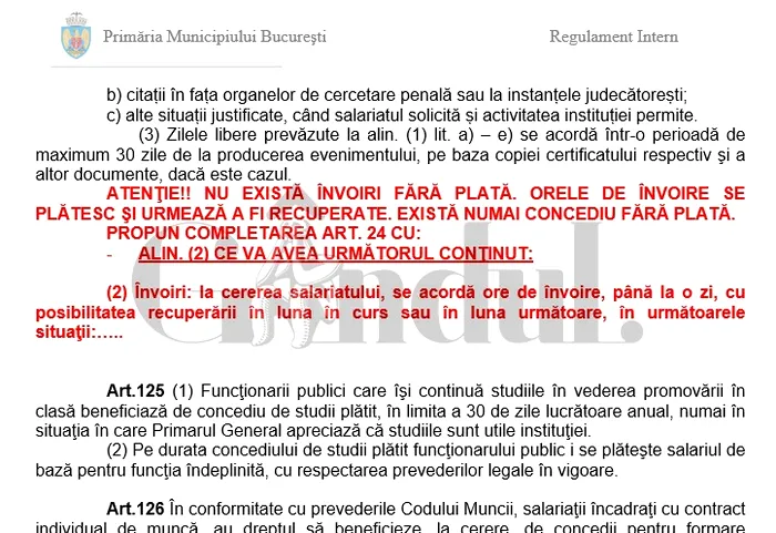 Un draft al Regulamentului de Ordine Interioră din Primăria Capitalei a fost trimis recent pe mail, pe adresa sindicaliștilor, de către Geta Drăgoi, director executiv al Directiei Managementul Resurselor Umane din PMB, cu indicația de a se menționa „cu roșu” eventualele modificări.