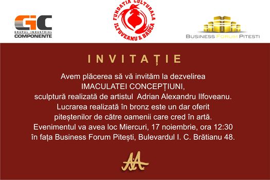 ”Imaculata Concepțiune”, una dintre păsările lui Adrian Ilfoveanu, o sculptură realizată în bronz, va fi dezvelită în fața Business Forum Pitești, miercuri 17 noiembrie, la ora 12.30. Lucrarea este un dar pe care piteștenii îl primesc din partea oamenilor care iubesc arta și cred în ea, dincolo de toate problemele unui cotidian măcinat de contradicții și provocări.