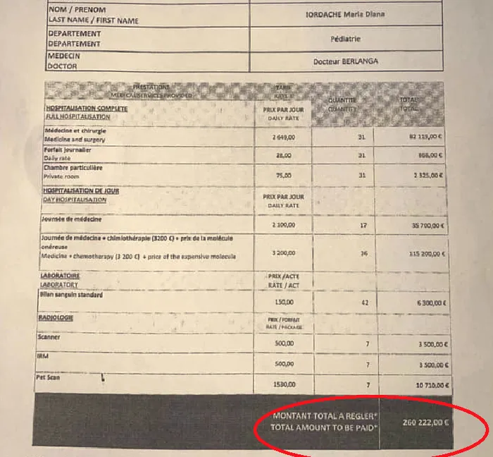 Părinții Dianei au trimis dosare la mai multe clinici din Europa, însă speranța a găsit-o la un centru din Franța, Gustave Roussy, care tratează aceste tipuri de cancer. Costurile sunt însă peste puterile familiei: 260.000 de euro, spitalizarea și operația, fără transportul în Franța.