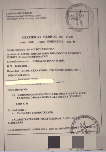 Aici au urmat alte analize și investigații, iar în cele din urmă, biopsia a scos la iveală diagnosticul: o tumoare care se așază pe oasele membrelor și apare în special la copii și adolescenți, cunoscută sub numele de rabdomiosarcom alveolar.