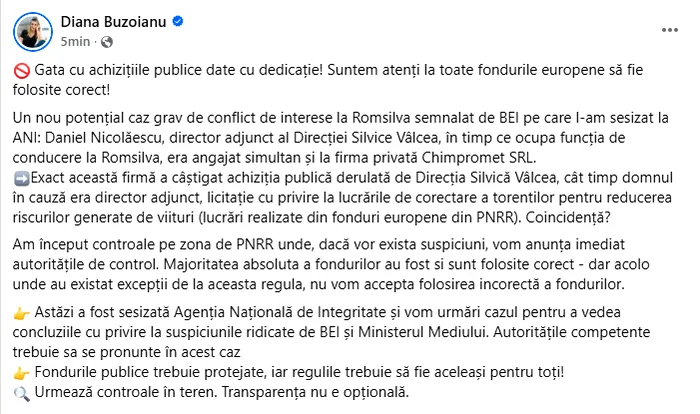 „Gata cu achizițiile publice date cu dedicație! Suntem atenți la toate fondurile europene să fie folosite corect! Un nou potențial caz grav de conflict de interese la Romsilva semnalat de BEI pe care l-am sesizat la ANI: Daniel Nicolăescu, director adjunct al Direcției Silvice Vâlcea, în timp ce ocupa funcția de conducere la Romsilva, era angajat simultan și la firma privată Chimpromet SRL. Exact această firmă a câștigat achiziția publică derulată de Direcția Silvică Vâlcea, cât timp domnul în cauză era director adjunct, licitație cu privire la lucrările de corectare a torentilor pentru reducerea riscurilor generate de viituri (lucrări realizate din fonduri europene din PNRR). Coincidență?”, a scris Diana Buzoianu pe Facebook.