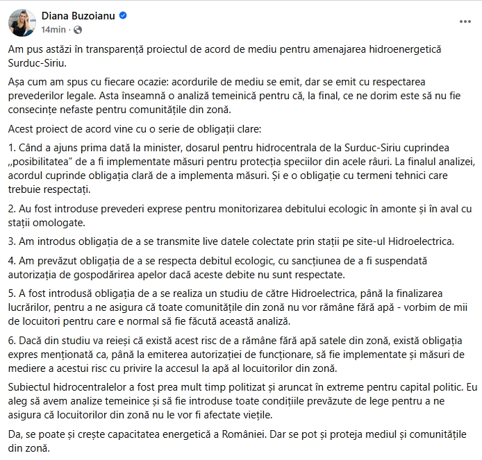 Prin intermediul unei postări pe pagina sa de Facebook, Diana Buzoianu a anunțat că a pus în transparență proiectul de acord de mediu pentru amenajarea hidroenergetică Surduc-Siriu.