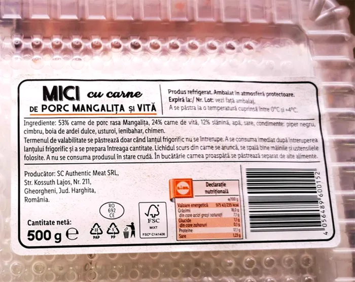 Dar din ce sunt făcuți, de fapt, micii de Mangaliță. Potrivit etichetei producătorilor un amestec de carne porc-vită, dar și alte ingrediente și condimente. La Lidl, găsești acest sortiment de mici.