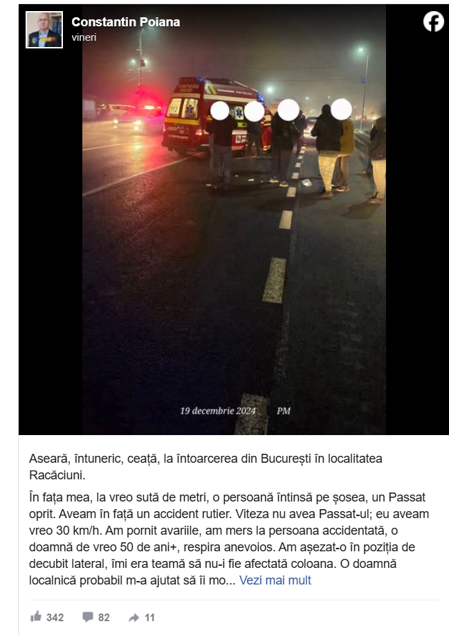 În incident era implicată o femeie de aproximatov 50 de ani, întinsă pe șosea și aflată în stare critică. Constantin Poiană a descris detaliat experiența dramatică pe Facebook: