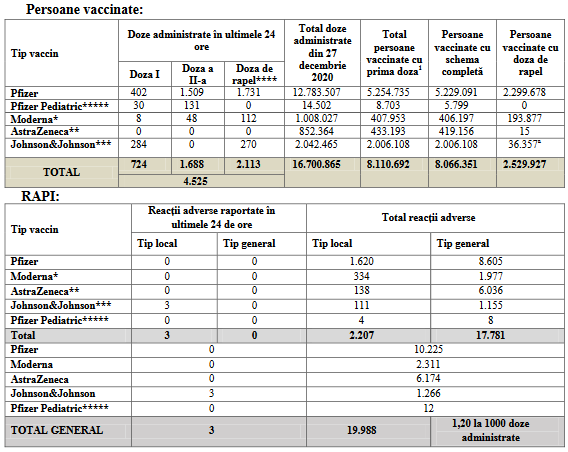 În ultimele 24 de ore au fost înregistrate trei reacţii adverse, iar de la începutul campaniei de vaccinare au fost raportate 19.988 de reacţii adverse. CNCAV precizează că 127 de reacţii adverse sunt în curs de investigare.