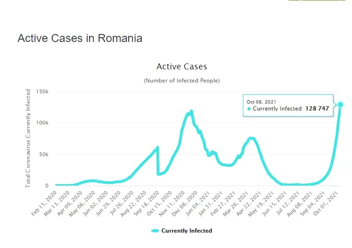 Potrivit Worldometer.info, sunt 128.747 de cazuri active în România, în timp ce autoritățile sanitare au raportat, vineri, peste 100.000.