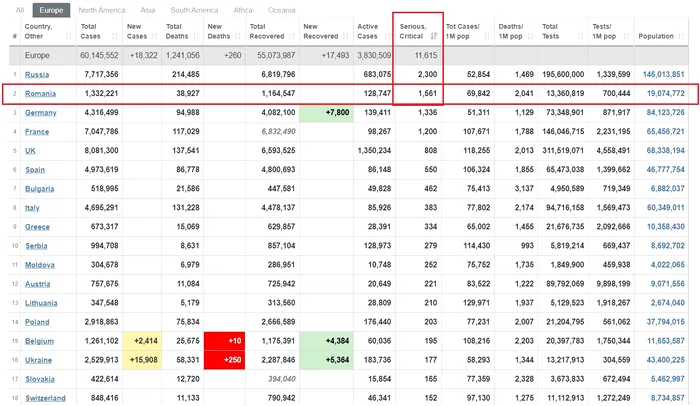 Doar Federația Rusă are mai multe cazuri grave COVID-19 decât România, potrivit Worldometers, un portal care centralizează datele pandemiei la nivel mondial. Rusia are 2.300 de pacienți în stare gravă, în timp ce România 1.561 de cazuri critice. Țările vecine României au mult mai puține cazuri critice: Bulgaria – 462, Ungaria – 100, Republica Moldova – 252, Ucraina – 177.