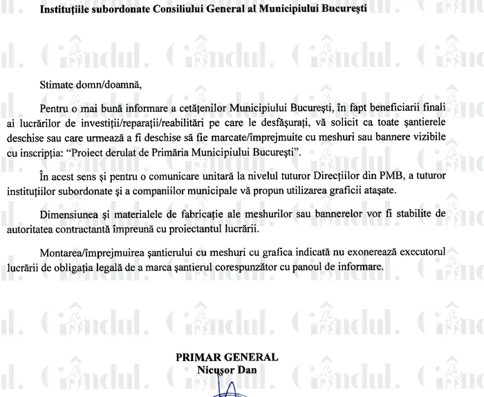 „Pentru o mai bună informare a cetățenilor Municipiului București, în fapt beneficiarii finali ai lucrărilor de investiții / reparații / reabilitări pe care le desfășurați, vă solicit ca toate șantierele deschise sau care urmează a fi deschise să fie marcate / împrejmuite cu meshuri sau bannere vizibile cu inscripția: «Proiect derulat de Primăria Municipiului București»”, se arată în documentul semnat de primarul Nicușor Dan.