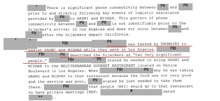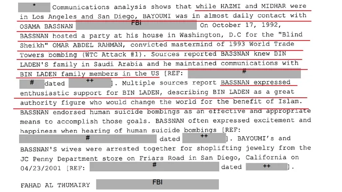 „(Suspectul intervievat– n.r.) a avut multe contacte în persoană sau la telefon cu indivizi care le-au pus la dispoziție sau sunt suspectați că le-ar fi pus la dispoziție lui Hazmi și Midhar suportul logistic necesar. Acești indivizi sunt Omar Al Bayoumi, Fahad Al Thumairy, Mohammed Muhanna, precum și alți suspecți din anchetele FBI”, se arată în document.