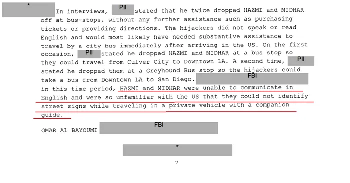 FBI subliniază că Hazmi și Midhar nu vorbeau deloc engleza, astfel că aveau nevoie de ajutor de fiecare dată când se deplasau în orașele din SUA.
