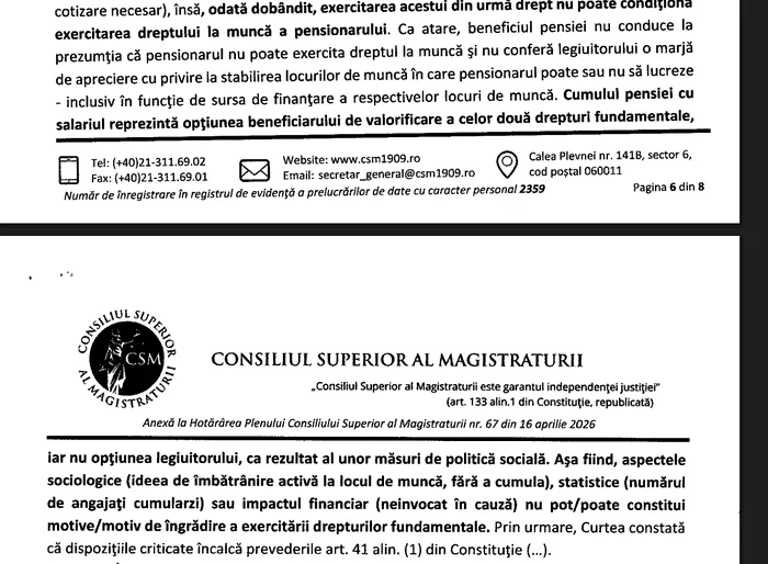 „Echivalează cu îngrădirea dreptului la muncă. Or, potrivit art. 41 alin. (1) fraza întâi din Constituţie, dreptul la muncă nu poate fi îngrădit. 58. Curtea constată că un drept fundamental sau exercitarea acestuia nu poate exclude beneficiul altui drept fundamental, de asemenea reglementat în Constituţie și reprezintă opţiunea beneficiarului de valorificare a celor două drepturi fundamentale”, transmite CSM.
