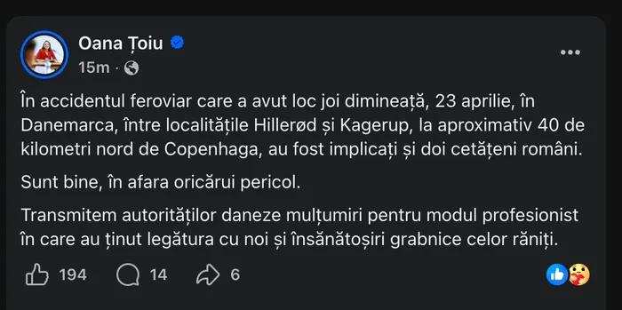 Doi români au fost implicați într-un accident feroviar în Copenhaga. Anunțul a fost făcut de ministra de Externe Oana Țoiu, printr-o postare pe Facebook.