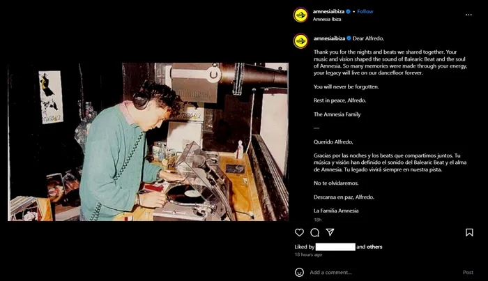 „Dragă Alfredo, îți mulțumesc pentru nopțile și ritmurile pe care le-am împărtășit împreună. Muzica și viziunea ta au modelat sunetul Balearic Beat și sufletul Amnesia. Atât de multe amintiri au fost făcute prin energia ta, moștenirea ta va trăi pe ringul nostru de dans pentru totdeauna. Nu vei fi uitat niciodată. Odihnește-te în pace, Alfredo”, au transmis reprezentanții clubului.