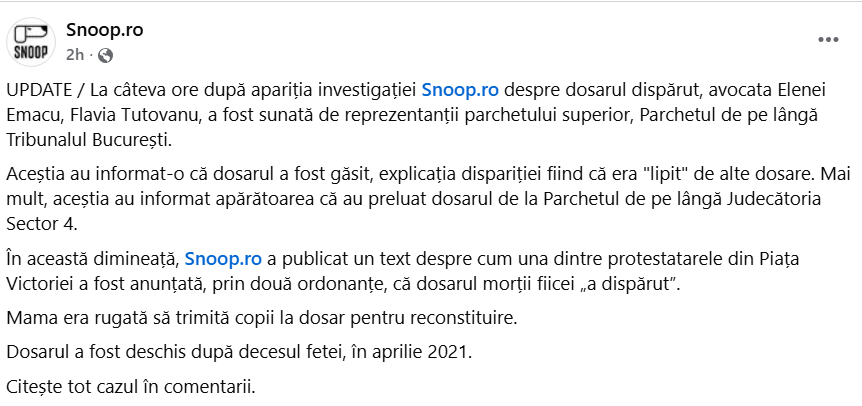 „Un dosar pentru care familia face zece solicitări de urgentare într-un an nu ar fi trebuit să se afle în lucru la un procuror? Cum de l-au căutat abia în 18 noiembrie, dacă eu le-am scris aproape lunar?”, a mai susținut Elena Emacu, pentru Snoop.