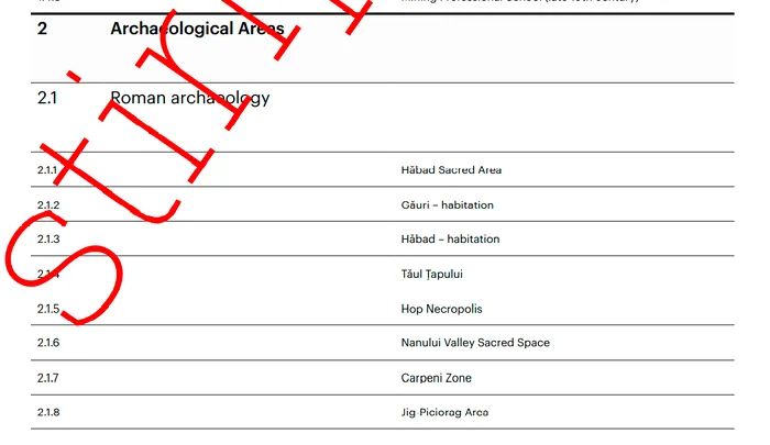 În schimb, dosarul – elaborat în anul 2016 de Ministerul Culturii, Institutul Național al Patrimoniului și depus la Centrul Patrimoniului Mondial UNESCO în ianuarie 2017 – nu menționează niciunul cele 11 certificate de descărcare de sarcină arheologică emise de Ministerul Culturii, certificate valabile care anulează regimul de protecție anterior al acestor zone. ”Aceste foste situri arheologice au fost descărcate de sarcină arheologică și nu mai pot fi propuse pentru clasare UNESCO, fiind lipsite de valoare arheologică și istorică”, dezvăluie sursele GÂNDUL.RO.