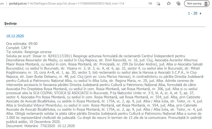 Deși acest lucru schimbă regimul juridic al zonei Roșia Montană propuse spre listare UNESCO – Hotărârea Tribunalului nu este parte a dosarului UNESCO și nici nu a fost comunicată către UNESCO.