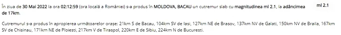 Un alt cutremur a avut loc luni dimineața, la ora 2:12, în județul Bacău. Acesta a avut o magnitudine mai mică, de 2,1 pe Richter.