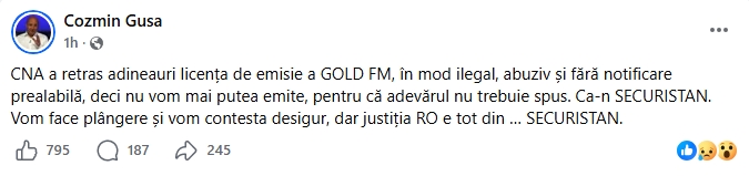 „CNA a retras adineauri licența de emisie a GOLD FM, în mod ilegal, abuziv și fără notificare prealabilă, deci nu vom mai putea emite, pentru că adevărul nu trebuie spus. Ca-n SECURISTAN. Vom face plângere și vom contesta desigur, dar justiția RO e tot din … SECURISTAN”