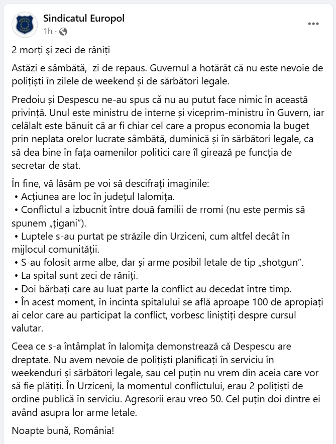 „Astăzi e sâmbătă, zi de repaus. Guvernul a hotărât că nu este nevoie de polițiști în zilele de weekend și de sărbători legale. Predoiu și Despescu ne-au spus că nu au putut face nimic în această privință. Unul este ministru de interne și viceprim-ministru în Guvern, iar celălalt este bănuit că ar fi chiar cel care a propus economia la buget prin neplata orelor lucrate sâmbătă, duminică și în sărbători legale, ca să dea bine în fața oamenilor politici care îl girează pe funcția de secretar de stat. Acțiunea are loc în județul Ialomița. Conflictul a izbucnit între două familii de rromi (nu este permis să spunem „țigani”). Luptele s-au purtat pe străzile din Urziceni, cum altfel decât în mijlocul comunității. S-au folosit arme albe, dar și arme posibil letale de tip „shotgun”. La spital sunt zeci de răniți. Doi bărbați care au luat parte la conflict au decedat între timp. În acest moment, în incinta spitalului se află aproape 100 de apropiați ai celor care au participat la conflict, vorbesc liniștiți despre cursul valutar. Ceea ce s-a întâmplat în Ialomița demonstrează că Despescu are dreptate. Nu avem nevoie de polițiști planificați în serviciu în weekenduri și sărbători legale, sau cel puțin nu vrem din aceia care vor să fie plătiți. În Urziceni, la momentul conflictului, erau 2 polițiști de ordine publică în serviciu. Agresorii erau vreo 50. Cel puțin doi dintre ei având asupra lor arme letale. Noapte bună, România!”
