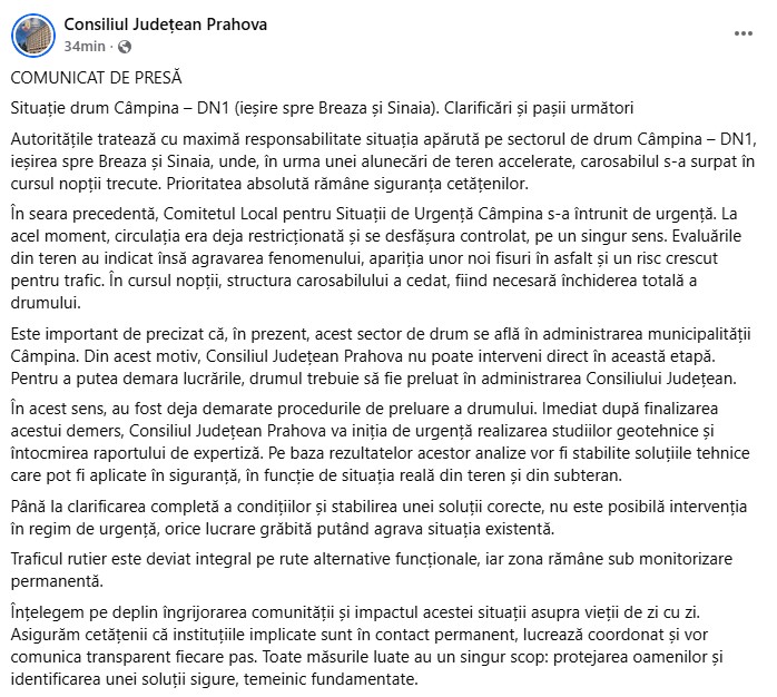”Este important de precizat că, în prezent, acest sector de drum se află în administrarea municipalității Câmpina. Din acest motiv, Consiliul Județean Prahova nu poate interveni direct în această etapă. Pentru a putea demara lucrările, drumul trebuie să fie preluat în administrarea Consiliului Județean.