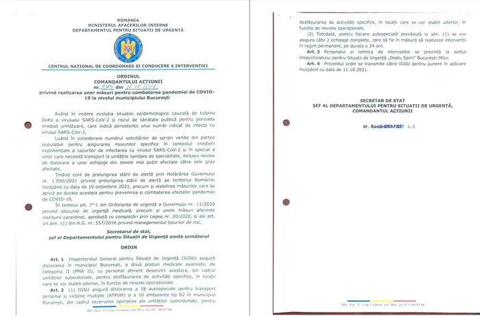 DSU a întocmit luni, 10 octombrie, 4 ordine care urmăresc  luarea unor măsuri imediate pentru gestionarea situației pandemice dificile din acest moment, la nivel național, având în vedere evoluția situației epidemiologice cauzată de tulpina Delta, astfel: