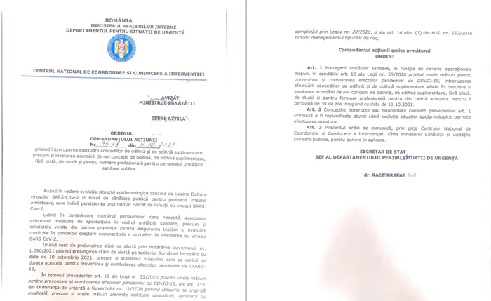 Managerii spitalelor pot dispune întreruperea concediilor de odihnă aflate în derulare, precum și încetarea acordării de noi concedii de odihnă, fără plată, de studii și pentru formare profesională, pentru o perioadă de 30 zile, în funcție de „nevoile operaționale”, prevede un Ordin elaborat astăzi de Departamentul pentru Situații de Urgență (DSU).