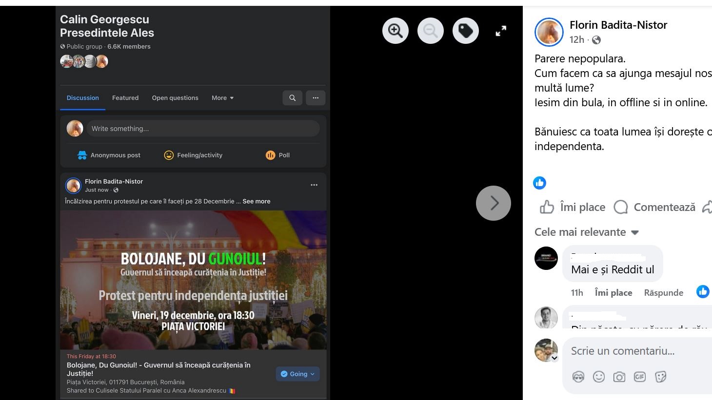 Bădiță a postat recent pe grupurile celor care îl susțin pe fostul candidat la președinție, Călin Georgescu, cărora le cere să se alăture protestelor #Rezist. Cum susținătorii fostului candidat la Alegerile Prezidențiale pregătesc un protest în 28 Decembrie, Bădiță vrea să-i convingă să vină să se antreneze la mitingul #Rezist de vineri din Piața Victoriei.