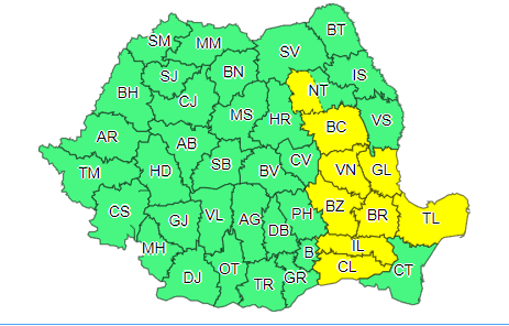 În intervalul 18 iulie, ora 12:00 – 18 iulie, ora 22:00, local în Moldova, Dobrogea, precum și în jumătatea de est a Munteniei vor fi perioade cu instabilitate atmosferică accentuată ce se va manifesta prin frecvente descărcări electrice, intensificări ale vântului (rafale în general de 55…70 km/h), vijelii, averse ce vor avea și caracter torențial (în intervale scurte de timp cantitățile de apă vor fi de 20…25 l/mp și izolat peste 30 l/mp) și grindină.