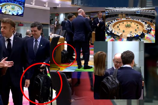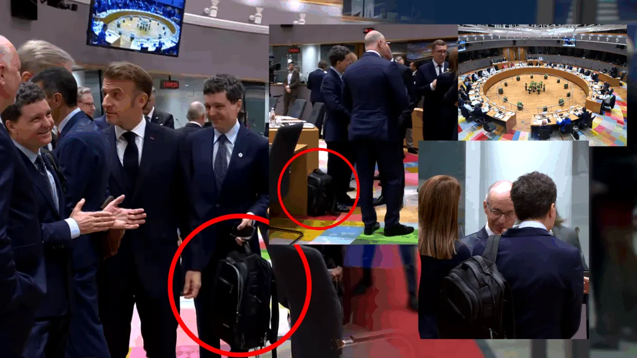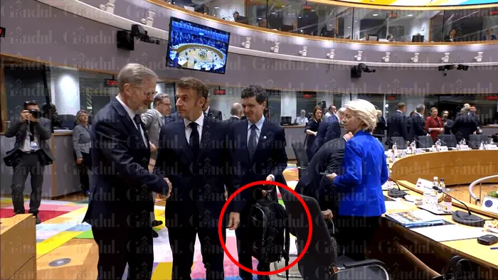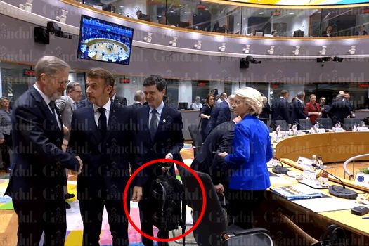 Mai trece ceva timp, și în Consiliu intră și Ursula von Der Leyen. După ce se salută, Nicușor Dan apare în spatele președintelui francez, cărându-și același ghiozdănel prin Consiliu. Îl „parcase” în altă parte. Apoi face tot turul de masă, cărând ghiozdănelul.