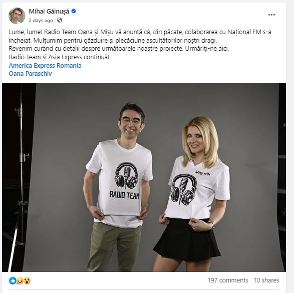 „Lume, lume! Radio Team Oana şi Mişu vă anunţă că, din păcate, colaborarea cu Naţional FM s-a încheiat. Mulţumim pentru găzduire şi plecăciune ascultătorilor noştri dragi. Revenim curând cu detalii despre următoarele noastre proiecte. Urmăriţi-ne aici. Radio Team şi Asia Express continuă”, este mesajul notat de Mihai Găinușă pe Facebook.