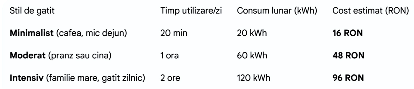 O plită cu inducție performantă, cu functia „Boost” activată pe mai multe zone de gătit, poate ajunge la un consum de 7.200W (7.2 kW).