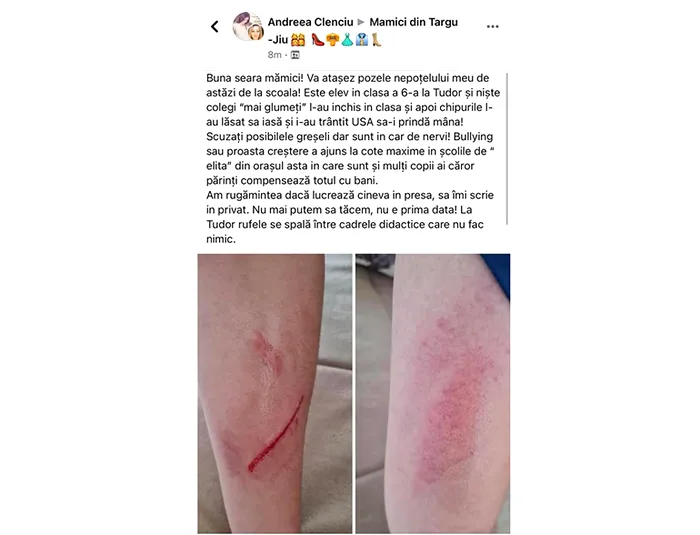 „Va ataşez pozele nepoţelului meu de astăzi de la scoala! Este elev in clasa a 6-a la Tudor şi nişte colegi “mai glumeţi” l-au inchis in clasa şi apoi chipurile l-au lăsat sa iasă şi i-au trântit USA sa-i prindă mâna! Scuzaţi posibilele greşeli dar sunt un car de nervi! Bullying sau proasta creştere a ajuns la cote maxime in şcolile de “ elita” din oraşul asta in care sunt şi mulţi copii ai căror părinţi compensează totul cu bani.”, a scris mătuşa elevului.