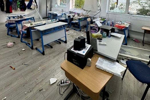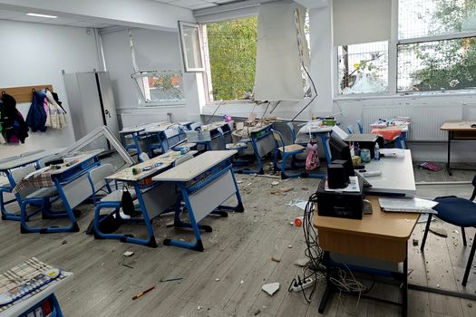 „Uite că au vrut să ne omoare copii”, spune o femeie care se află într-o sală de curs a liceului.