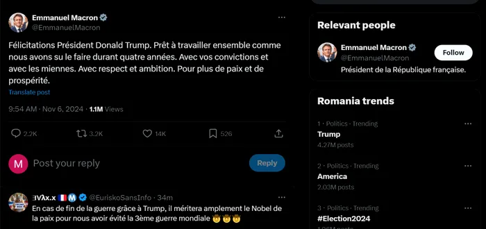 „Felicitări președintelui Donald Trump. Gata să lucrăm împreună, așa cum am făcut-o în ultimii patru ani. Cu convingerile voastre și cu ale mele. Cu respect și ambiție. Pentru mai multă pace și prosperitate”, a transmis Emmanuel Macron într-un mesaj pe X.