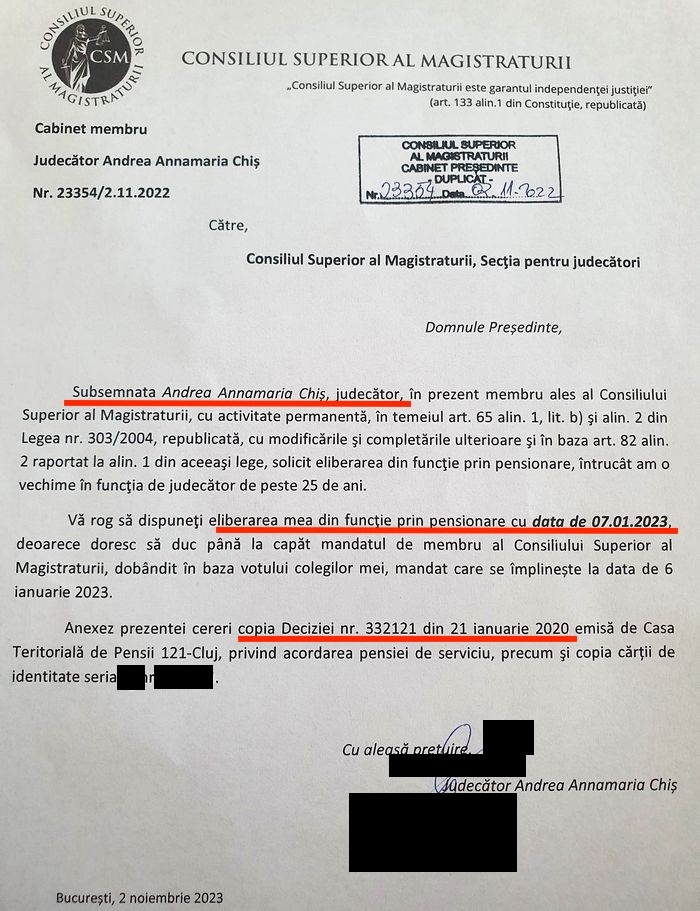 Anunțul lui Chiș privind decizia de pensionare efectivă a fost făcut abia în noiembrie 2022, în secția de judecători a CSM, așa cum arată documentele. Iar ieșirea la pensie s-a petrecut începând cu data de 7 ianuarie 2023.