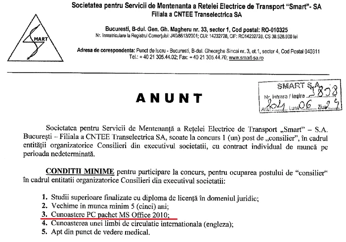 Pe 24 iunie, Societatea pentru Servicii de Mentenanță a Rețelei Electrice de Transport ”Smart” – SA, Transelectrica anunța scoaterea la concusr a unui post de „consilier cu studii superioare finalizate cu diplomă de licență în domeniul juridic și vechime în muncă 5 ani”.