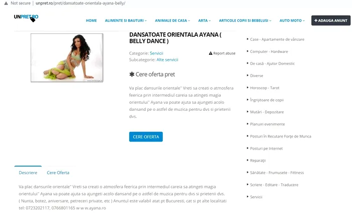 Ea a practicat dansuri orientale și dintr-o serie de anunțuri rezultă că își vindea serviciile pe sume ce porneau de la 100 de euro. Anunțurile sunt încă online, numele ei de scenă fiind „Ayana”.