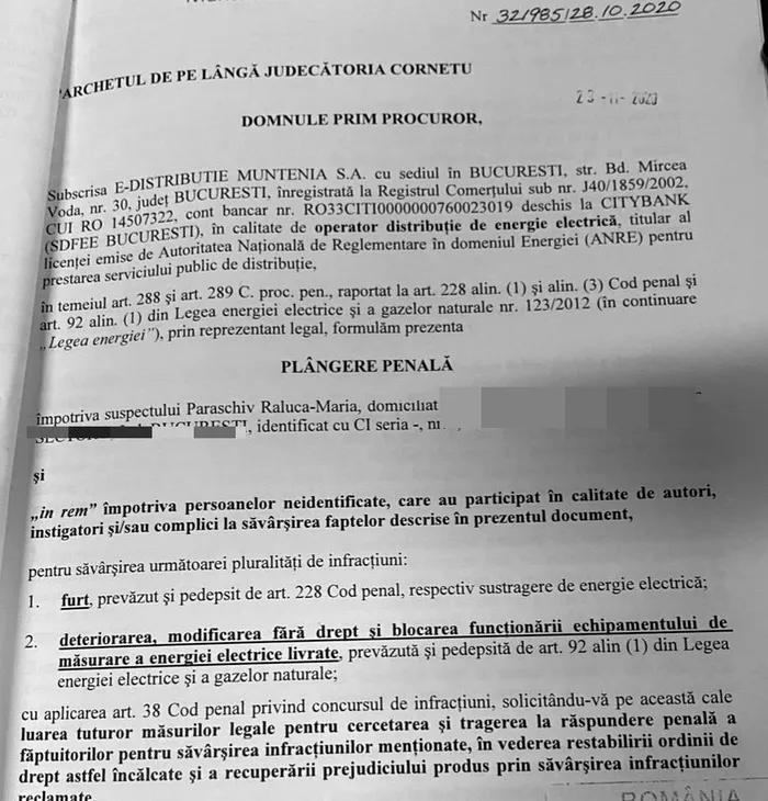 Operatorul de energie electrică a formulat pe numele Ralucăi Paraschiv o plângere penală la Parchetul de pe lângă Judecătoria Cornetu, în care o acuză de furt, respectiv sustragere de energie electrică, dar și pentru „deteriorarea, modificarea fără drept și blocarea funcționării echipamentului de măsurare a energiei electrice virale”.