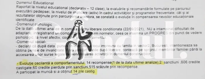 Dar, de la data ultimei analize în comisia pentru liberare condiționată (22 septembrie 2021), ”NU a întâmpinat dificultăți de adaptare, înregistrând un comportament conform normelor, ceea ce înseamnă un PROGRES din punct de vedere psihologic, la nivel cognitiv și comportamental”, se precizează în caracterizare.