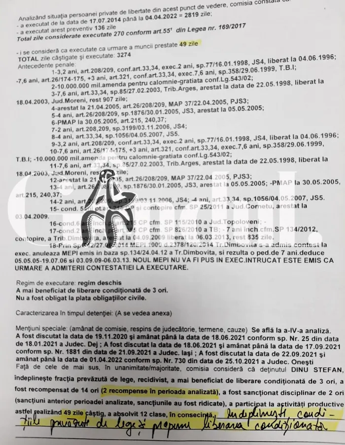În consecință, Comisia a stabilit – pe data de 4 aprilie 2022 – că Ștefan Dinu ”îndeplinește condițiile prevăzute de lege și propune liberarea condiționată”.