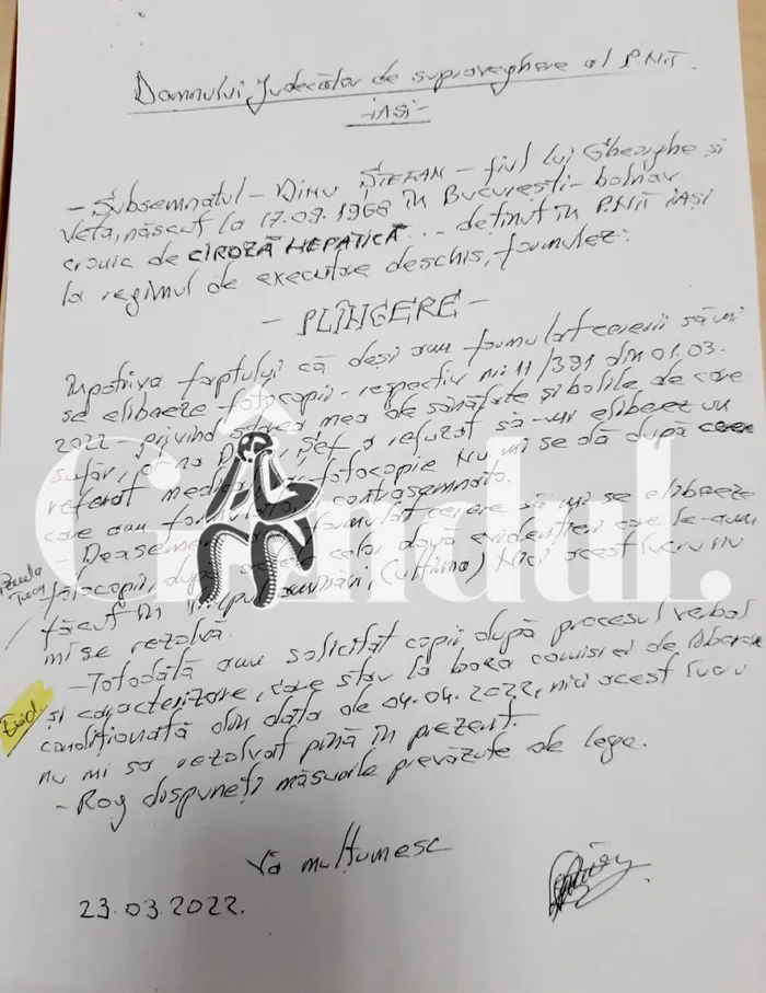 Dar deținutul acuză faptul că din dosarul medical i-au fost sustrase acte care dovedesc boala de care suferă, spune că nu a primit tratamentul medical adecvat, dar și că în caracterizarea sa nu au fost trecute toate activitățile – programe sociale și programe psihologice – pe care le-a prestat în penitenciar.