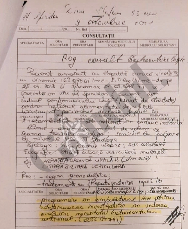 Deținutul și soția sa au înaintat, la un moment dat, și o sesizare către Colegiul Medicilor București, menționând acesta a fost infectat, pe perioada detenției în ANP, cu virusul hepatic B, iar tratamentul cu Entecavir a fost amânat în mod nejustificat.