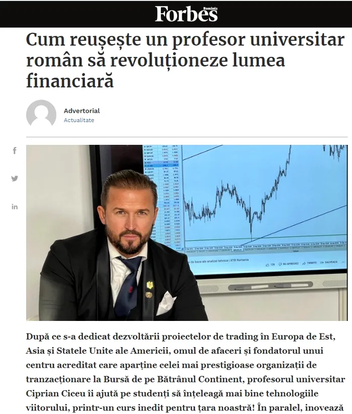 ”Cu o experienţă de peste 20 de ani în domenii precum antreprenoriat, management, planificare de afaceri, analiză financiară, inginerie software şi operaţii şi analiză a deciziilor, Ciprian Ciceu se implică în formarea noii generaţii, ajutând studenţii români să descopere… o nouă lume financiară! Din 2022, este „profesorul de Blockchain” de la Facultatea Româno-Americană, un domeniu care, potrivit unui raport al start-up-ului Stakeborg, va genera 40 de milioane de noi locuri de muncă în anii următori. Tinerii au astfel acces la un curs care, în general, este predat la universități de peste hotare, precum renumitele MIT, Oxford și Harvard”, se menționează în advertorialul publicat de forbes.ro, de unde nu lipsește nici declarația lui Ciceu.