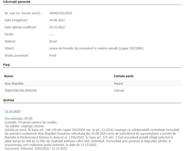 ”Prin referatul din 10.08.2022 din dosarul nr. 1356/2022, judecătorul de supraveghere a privării de libertate din cadrul Penitenciarului Rahova a analizat înscrisurile solicitate (…), constatând că nu poate fi iniţiată procedura privind transferul petentului (n.red. – Abdullah Ataș) pentru continuarea executării pedepsei într-un penitenciar din Turcia.