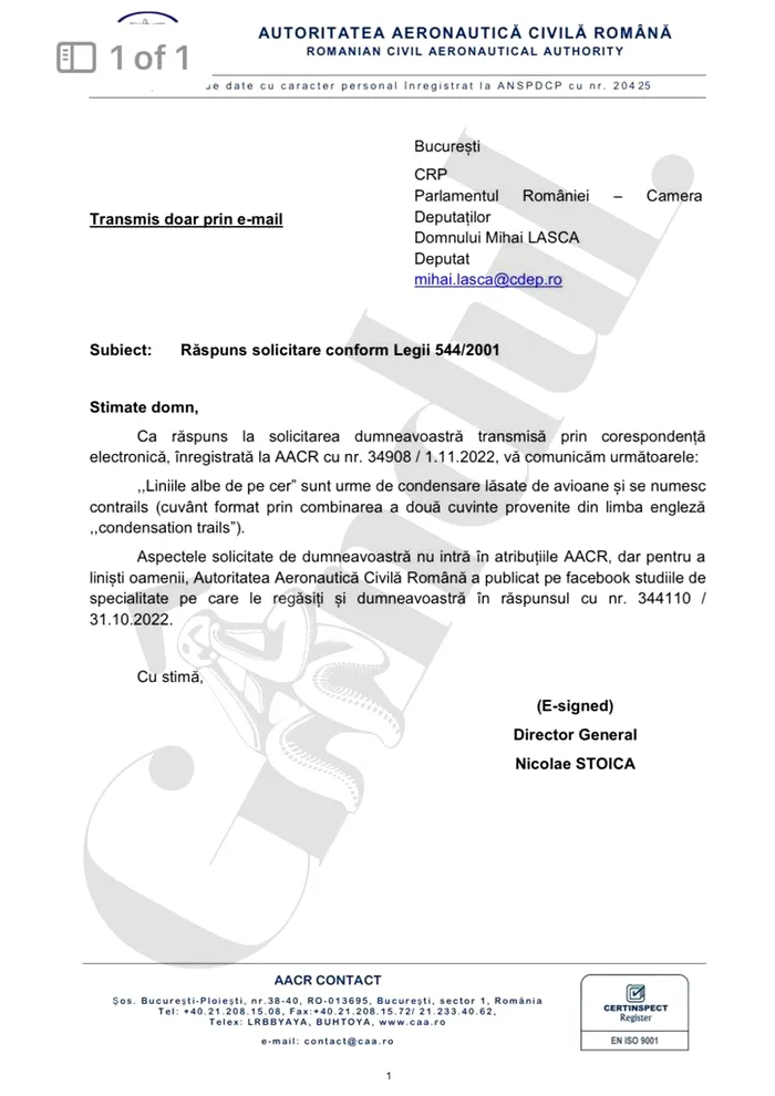 ”Stimate domn, ca răspuns la solicitarea dumneavoastră (…) vă comunicăm următoarele: «Liniile albe de pe cer» sunt urme de condensare lăsate de avioane și se numesc contrails (cuvânt format din condensarea a două cuvinte provenite din limba engleză – condensation trails. Aspectele solicitate de dumneavoastră nu intră în atribuțiile AACR dar, pentru a liniști oamenii, AACR a publicat pe Facebook studiile de specialitate pe care le regăsiți și dumneavoastră în răspunsul (…)”, au transmis reprezentanții AACR.