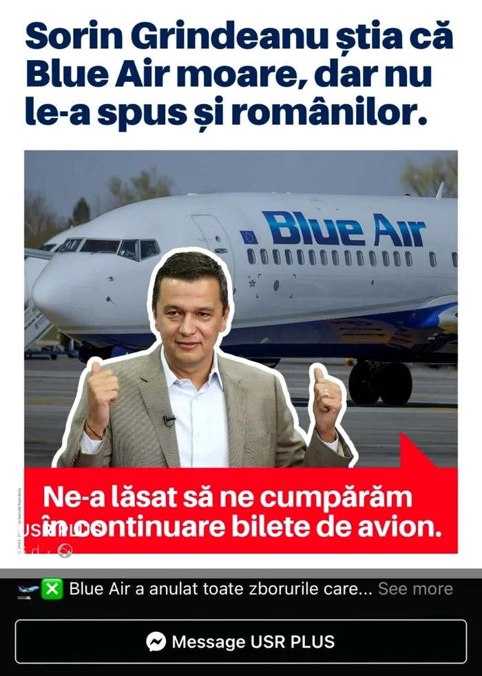 Într-o tentativă de spălare pe mâini, reprezentanții USR au inițiat o diversiune prin publicațiile ”de casă”, unde au pus tunurile pe actuala conducere a Ministerului Transporturilor. Astfel, o anumită parte a presei – racordată la interesele USR – a titrat că ”Grindeanu (PSD) știa că Blue Air moare, dar nu le-a spus și românilor”.