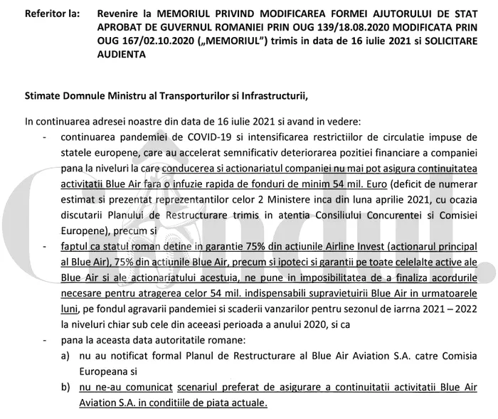 În luna august a anului 2021, compania Blue Air a trimis către ministrul Transporturilor, Cătălin Drulă, dar și către premierul de atunci al României – Florin Cîțu – o ”Revenire la Memoriul privind modificarea formei ajutorului de stat aprobat prin OUG 139/18.08.2020, modificată prin OUG 167/2.10.2020”, solicitând și o audiență.