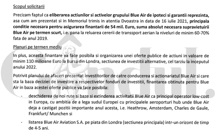 Reprezentanții Blue Air l-au informat pe Cătălin Drulă că suma de 54 de milioane de euro este ”absolut necesară supraviețuirii” companiei ”pe termen scurt”, urmând ca infuzia de capital să facă posibilă ”organizarea unei oferte publice de acțiuni în valoare de minim 110 milioane de euro la Bursa din Londra”, ”cel târziu la începutul anului 2022”.